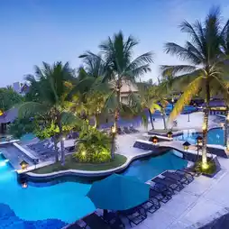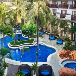 Nestled in the heart of Kuta, the Hard Rock Hotel Bali is a hit for its prime location and vibrant atmosphere, complete with live entertainment that delights many guests, though a few note it can be noisy. The pool area is a crowd-pleaser among families and adults, earning high marks for fun and variety.