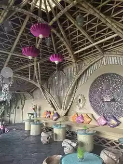 The combination of the pink sofa, cute lantern-like decorations, and the beautiful green terraced rice field view is truly photogenic 🫶