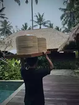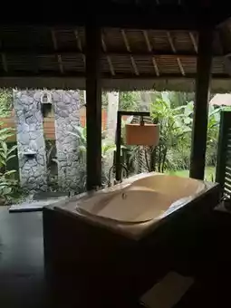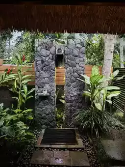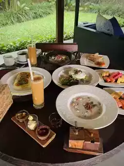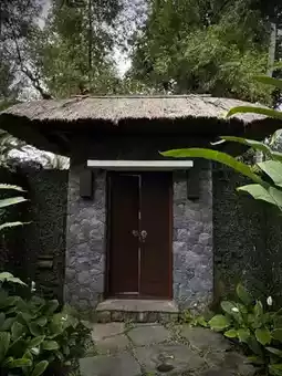 🛖 The overall architectural style of the hotel blends traditional Balinese elements with modern design, mainly using wooden structures paired with thatched roofs. The hotel lobby features a simple open design, with a lounge next to it for guests waiting to check in or check out. The entire hotel is very large, with a feeling of a primeval forest, featuring a main pool, a restaurant, and a spa area. There are a total of 23 villas, each with a private pool, offering great privacy.
