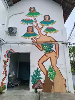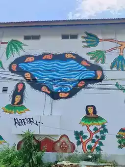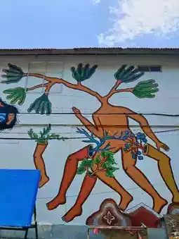 Encountering this strange work of art on a building wall at the bus station is a mindtrip. Like many other artworks, when experienced perhaps it is better not to ask why, or how, it came to be, at this unlikely location. Its vastness is impossible to capture in one frame, overlooking an abandoned piece of land that looks like it is currently being developed. With decapitated heads circulating around waves, and tree-headed humanoids with severed limbs, its absurdist, and magical-realist tinges remind us of Dali's many twisted anatomical art pieces, Bosch's triptych "The Garden of Earthly Delights", and that French film directed by René Laloux, "La Planète Sauvage", among others.