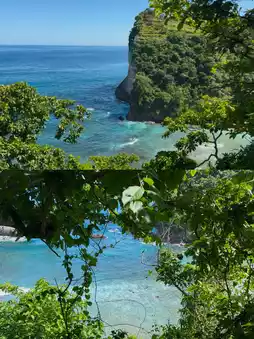 | Atuh Beach. 🌟 Highlights: Atuh Beach is a refreshing seaside destination on Nusa Penida Island, located on the southeastern coast of the island. It is surrounded by towering cliffs, forming a secluded and tranquil cove. Atuh Beach is famous for its soft, fine crescent-shaped white sand, which contrasts sharply with the turquoise sea, creating a stunning natural landscape.