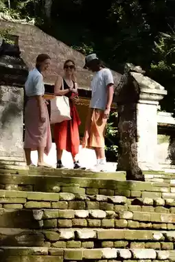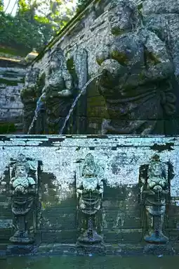 Twelve maiden statues at the sacred spring pool hold broken water jars in eternal kneeling poses. Archaeological reports record that the 11th-century bath once had a hot spring flowing, but now the moss at the pool’s bottom weaves an emerald spiderweb, and the occasional drops of holy water spread faint brown rings on the stone surface.