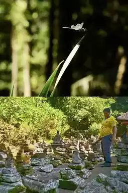 Deep in the forest valley lie the folds of time. On a tilted basalt rock, beneath a moss-woven green carpet, a half-exposed Buddha stupa relief emerges, with flying ribbons and fern tendrils entwined and growing.