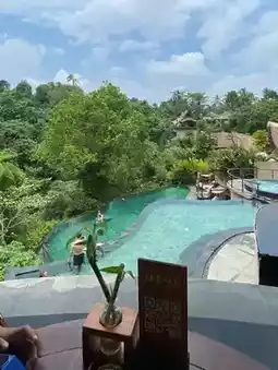My recommendations in Ubud are Cretya Ubud and the Monkey Forest. At Cretya Ubud, you can wear dresses and ride swings (Photo 4), compare and taste various coffee flavors (Photo 5), and have many experiences you can’t have in Japan. Also, you can swim in the pool from morning till night (Photo 6), making it a place you can enjoy all day. At the Monkey Forest, you can see many monkeys at a distance you wouldn’t imagine in Japan. They pulled on clothes and climbed on shoulders, and they were very cute (Photo 7).