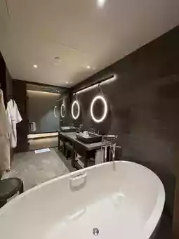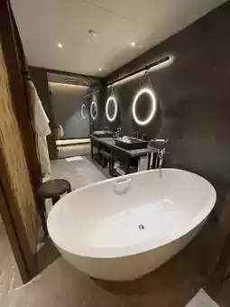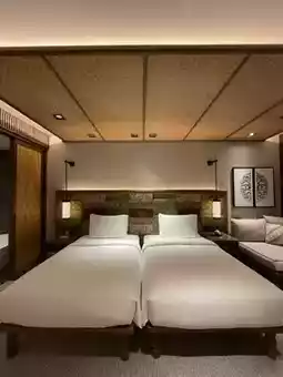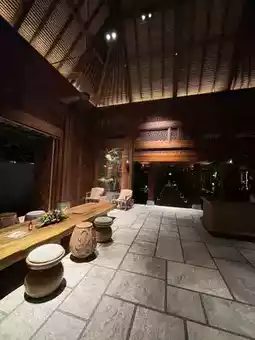 The entire hotel is designed to evoke a traditional Balinese village, harmonizing warm architecture using wood and stone with modern, sophisticated interiors. The resort features lush gardens and lagoon pools, creating a relaxing and serene atmosphere.