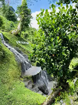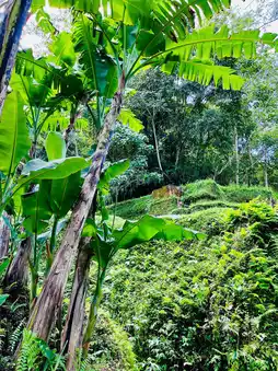 Uma Ceking Rice Terrace in spring is a breathtaking sight, with lush green paddy fields stretching across the terraced landscape. The rice paddies, at their peak vibrancy, create a mesmerizing patchwork of emerald hues that contrast beautifully with the surrounding wild trees and abundant flora. Towering banana trees sway gently in the warm breeze, adding to the tropical charm of the scene. A cascading waterfall flows gracefully, weaving through the terraces and enhancing the natural beauty of the area. The rhythmic sound of water trickling down the steps of the rice fields complements the serene atmosphere, making it a perfect spot for nature lovers and photographers alike.