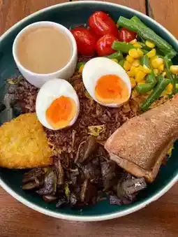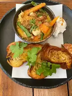 * All prices include an additional 10% tax and 6.5% service charge. Pison is divided into outdoor and indoor seating. The indoor area has air conditioning, making it comfortable. The outdoor area is also pleasant when it’s not too hot (early morning, evening), feeling cool and nice. I ordered THE JAPANESE BOWL and CREAMY CHICKEN CROISSANT.