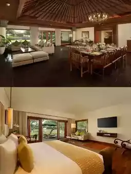 Design style: A blend of traditional Balinese and modern decor, using custom furniture, local artworks, and light-colored flooring to create an elegant island vibe.
