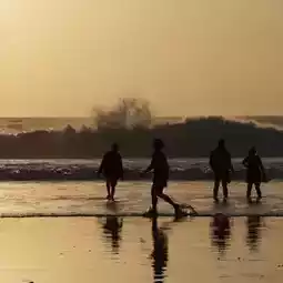 The waves roll in like clockwork, the surfers catch their last rides, and the whole beach seems to pause for that one perfect golden moment. 🏄♂️🌊
