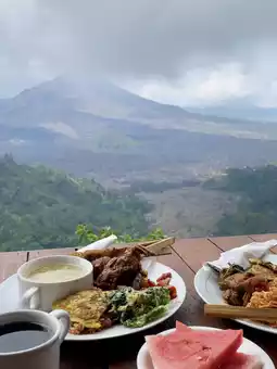Yes, friends. I had lunch with Mount Batur watching me chew like some majestic, smoky food critic in the background. The sambal? Spicy. The rice? Fluffy. The view? Out of control. I swear that mountain made the food taste 10x better. Or maybe I was just overwhelmed by the altitude and the spice level. Either way, zero regrets.