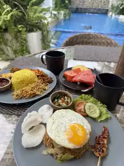 🌸 The breakfast here is amazing! Their smoothie bowl is super refreshing and packed with flavor — a perfect tropical start to the day. And don’t miss the nasi kuning – rich, aromatic, and full of local taste. Definitely a must-try!