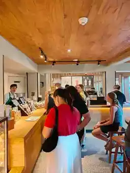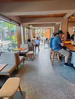 Inside, it was cool and quiet. The hum of the air-conditioning met the soft clatter of cups and the low chatter of guests—a sharp yet soothing contrast to the outside bustle. Sleek wooden accents and tropical design touches made the space feel both familiar and locally inspired. Finding a seat by the window was a stroke of luck—it turned this coffee break into a front-row view of the world passing by.
