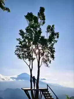 To reach the top, you need to take a jeep for about 1 kilometer, which costs 50,000 IDR. If you opt for the Bali Swing, there’s an additional charge of around 120,000 IDR. At the top, you’ll find a Balinese gate, a treehouse, and plenty of spots to take photos and enjoy the surrounding views.