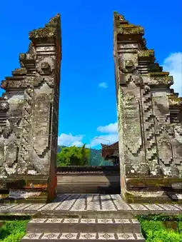 For tourists, the multi-tiered Hindu-style shrines with thatched roofs standing in the lake are a popular spot for photos 📸. These shrines feature a square structure with pagoda-style thatched roofs atop a brick base, showcasing typical Balinese characteristics. The shrines, the lake, and the distant mountain ranges together form a picturesque scene. The temple's entrance gate, known as the 'Good and Evil Gate,' is another Balinese architectural highlight and a favorite photo spot.