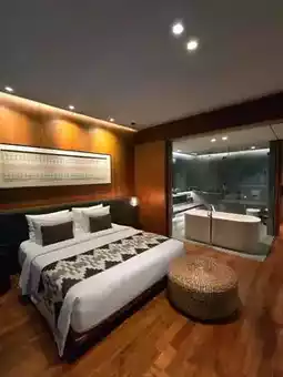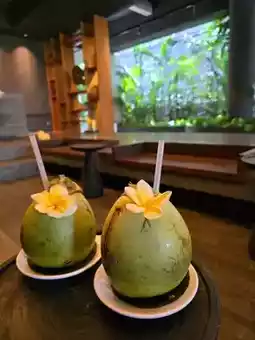 As it's new, the hotel's design is fresh and modern, with a subtle, modern aesthetic, dominated by wood tones and soft lighting. After checking in through a narrow corridor, I arrived at the lobby, where I sat down in the sunken waiting area. The attentive waiter served me a welcome drink of whole young coconuts, a truly unique experience.