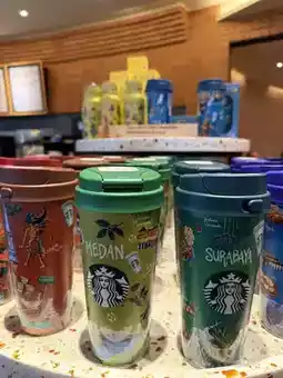 The cup features the godlike face of the Barong, his mouth open and teeth bared, awe-inspiring yet fearless. Dancers, gamelan instruments, and classic island dishes like Nasi Campur and Ayam Betutu all grace the design. More than just a coffee container, it's like a miniature map, encapsulating Bali's soul, cuisine, mythology, and dance.