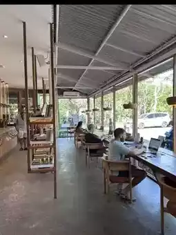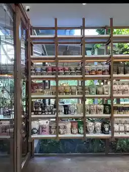 The drinks menu is more focused on health-conscious options like kombucha, coconut water, and herbal teas than coffee.