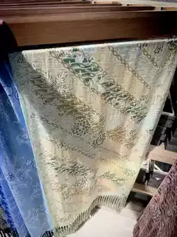 The cloth in your photo has a blue background with orange flowers and leaves interspersed throughout. The edges are decorated with intricate traditional patterns, and even faint silhouettes of animals and people can be seen, creating a sense of story. This kind of cloth can be used as a shawl, tablecloth, or hanging ornament; it is often seen as a carrier of cultural memory.