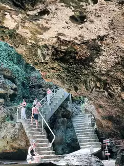 The atmosphere here is unique, characterized by towering limestone cliffs and caves that lead to the beach. It is a small beach surrounded by rocks and crystal-clear blue waters, perfect for relaxing, enjoying the sea view, and taking photos. However, accessing the beach requires descending about 100-120 steps through a narrow path in the cave, which adds a mysterious and exciting vibe.