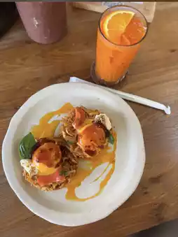 I was looking for a place to enjoy brunch and bread in Seminyak and ended up at Bread Yard. True to its name, it's a bakery and cafe, so the moment I walked in, the aroma of freshly baked bread filled the air. The interior, with its warm wood-toned interior and large windows letting in sunlight, was perfect for breakfast or lunch. The display case was filled with a variety of baked goods, including croissants, sourdough bread, muffins, and sandwiches. The menu also included pasta, salad, and brunch plates, allowing me to enjoy both a meal and dessert. I ordered a ham and cheese croissant and an iced latte. The croissant was crispy on the outside, moist on the inside, and richly buttery, offering high-quality flavor. The coffee had just the right amount of acidity, complementing the bread perfectly. 🥐☕ My companion's salad bowl was also packed with fresh vegetables and quinoa, making it a healthy meal. The prices weren't too steep for Seminyak standards, and they were reasonable considering the quantity and quality of the food. The staff were cheerful and friendly, and the food came out quickly, so there wasn't a long wait. Overall, I think this cafe is a great place to enjoy a light breakfast of coffee and pastries, or even a full brunch meal.
