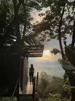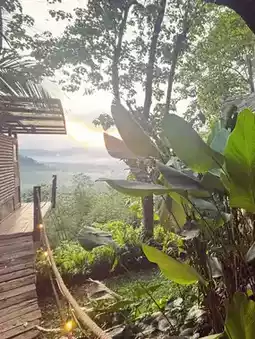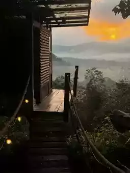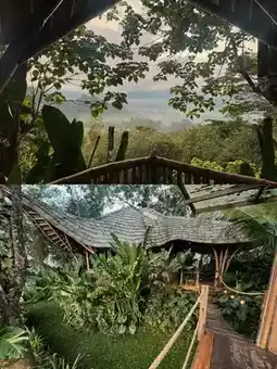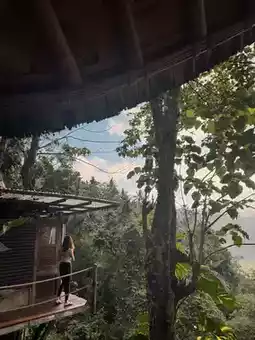 🪵 During our stay, we had two houses: one treehouse and one bamboo house 🎋. The bamboo house is entirely constructed from bamboo, while the treehouse is built with wooden planks and structured around two large trees. The two houses are connected by an outdoor kitchen and dining area, as well as a suspension bridge. Each house also has its own outdoor shower and toilet.