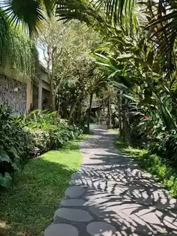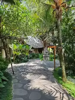 A Bali restaurant with an impressive pool and lush entrance, perfect for enjoying the view.
