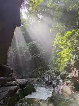 • The scenery is lush and immersive — mossy jungle, mist, the sound of rushing water, and a natural pool at the base where you can cool off.