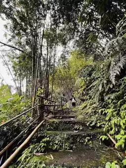 To reach the waterfall, visitors walk a trail from the parking area down through lush tropical jungle, past plantations (coffee, clove) and some small shops. The walk is moderate in difficulty and takes around 10-20 minutes depending on which waterfall point you aim for.