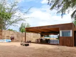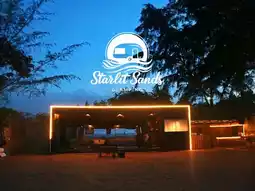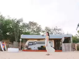 🚃5. Starlit Sands Glamping is a silver caravan with a kitchen area with a mini bar and a table for you to chill.