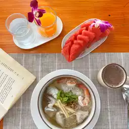 Breakfast is served right in front of the accommodation. For dinner, you can purchase fresh produce. You can grill seafood. The accommodation provides a barbecue grill and plates, bowls, and spoons.