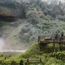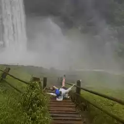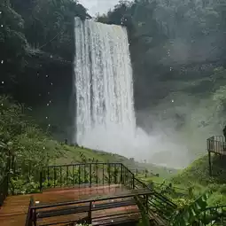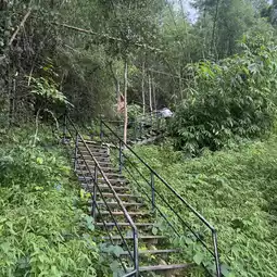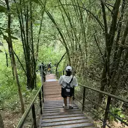 You can enjoy the waterfall view from the wooden bridge. Don't even think about walking on it if your shoes don't have treads. And once you've had your fill of the view, get ready to climb back up the stairs! 🙌🏻