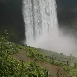It boasts a large waterfall cascading down from a tall rocky cliff.