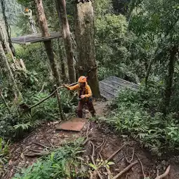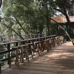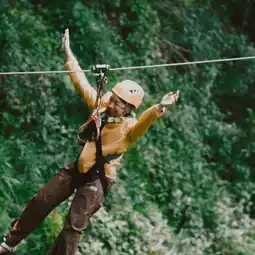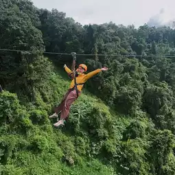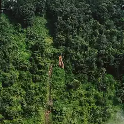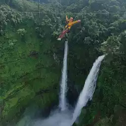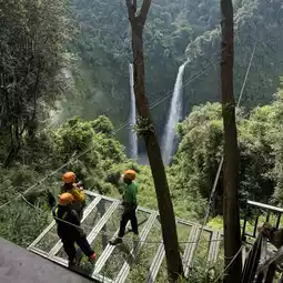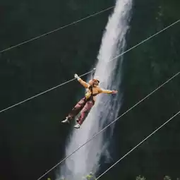 The first one is the longest and most beautiful because it crosses the waterfall below. On this one, you'll go with a staff member, one on each side, parallel to the other. It might be a bit scary going up, but halfway through, it starts to get fun.