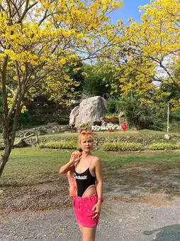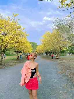 Indian yellow has arrived, mom. This is Nakhon Nayok, Kaiwa Garden, standing beautifully, the photographer and model are ready. It's not far from our house, this place is near Ka-ang Waterfall, the atmosphere is very good. Now only the first batch of Indians are left. But I'm telling you, they're dropping very quickly. If anyone is coming, you have to check first because they'll be out again in about two weeks. But I guarantee that if you come in time, you'll get a lot of beautiful pictures. #NakhonNayok #IndianYellow #KaiwaGarden #Ka-angWaterfall