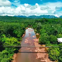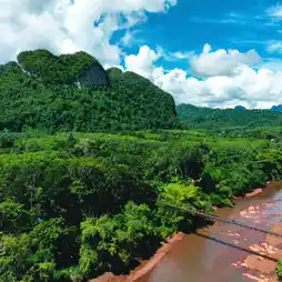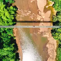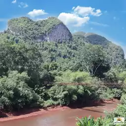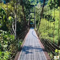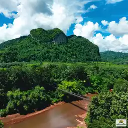 🌉🌿❤️Khao Phang Suspension Bridge, or its full name, Ban Khao Theppitak Suspension Bridge, is a small cable-stayed bridge across the river. It is approximately 120 meters long and you can see the Heart-shaped Mountain or Theppitak Mountain from the bridge.