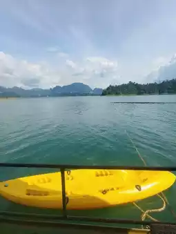 ✨ We reached the resort base by boat. During the water journey across Cheow Lan Lake, we marveled at the majestic cliffs.