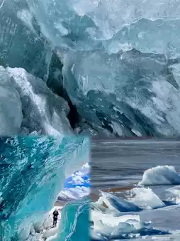 Glacial Ice Caves: Venture inside to discover crystal-clear caves adorned with stalactites and stalagmites. The blue ice glows mysteriously in dim light, creating a fairy-tale winter wonderland.