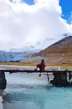 Walk on broken ice to get close to the glacier! Along the way, Tibetan women in red dresses and white stupas make for great photos.