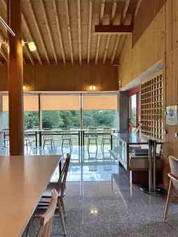 The lush natural scenery visible from the cafe's windows creates a relaxing moment. 🌼