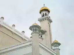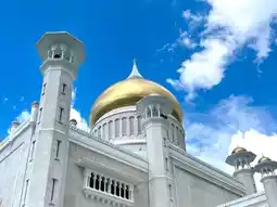 The mosque’s golden dome shines brilliantly under the sun, symbolizing Brunei’s rich Islamic heritage.