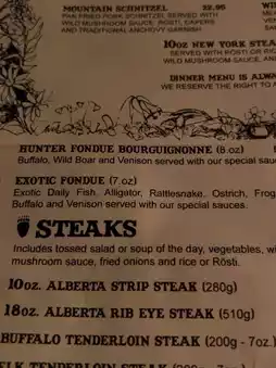 Located on Banff Avenue, the busiest stretch of the city, it's easy to find on foot. The restaurant's quaint log cabin interior creates a rich, Western-inspired ambiance, creating a unique atmosphere whether bathed in sunlight during the day or illuminated by the dim lights at night. They specialize in a variety of steaks, with the local AAA-grade steak being a popular choice, boasting a crispy exterior and tender interior that perfectly captures the flavor of the local beef. For those looking for something a little more exotic, they also offer a variety of exotic game dishes, such as duck, bison, and game platters, all generously portioned and delicious.