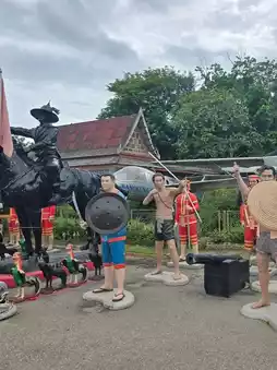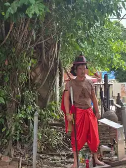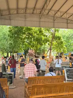 Not far from Amphawa Floating Market It is historically important and is known for its "Bodhi Tree Church", an old chapel covered with the roots of Bodhi trees, Krang trees and Krai trees, making it look Unseen and sacred. Bodhi Tree Church The highlight of the temple is the chapel covered with large tree roots. Inside is Luang Pho Nil Mani, a sacred Buddha image that people like to worship. Inside the chapel, there are also beautiful old murals telling the story of the life of the Buddha at Bang Kung Camp. The temple area used to be a military camp during the reign of King Taksin the Great. Currently, there is a replica of Bang Kung Camp for visitors to see. On the opposite side, there is also a small zoo with sheep, horses, camels and goats. You can bring your children to feed the animals.