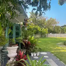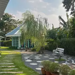 🏡A hidden cafe by the canal in Nonthaburi. Baan Ton Pikun Coffee & Bistro is a garden-style cafe. The shop is a white house in the middle of a green lawn, surrounded by various trees. The atmosphere is shady and located next to the river. The shop offers both food and drinks. The shop is also pet-friendly. You can bring your dog or cat to run on the lawn.