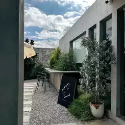 🌟 The shop's décor combines a Brutalist and Loft style with exposed concrete structures and a cool, raw gray tone. There are both indoor and outdoor areas, with a refreshing centerpiece of trees.