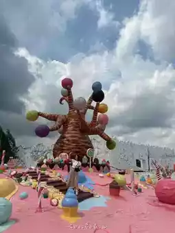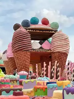 • The interior is designed to look like a world of desserts, with ice cream, donuts, and large candies scattered throughout the area.