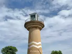 Located by the sea, surrounded by a view of the blue sea, bright sky, and green trees contrasting with the vintage sand-colored lighthouse. Every angle is beautiful without much editing.