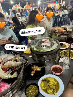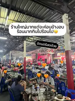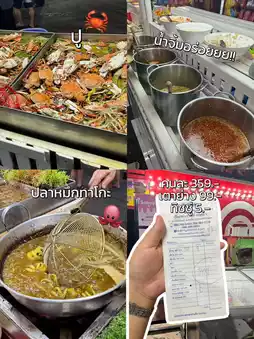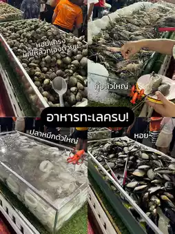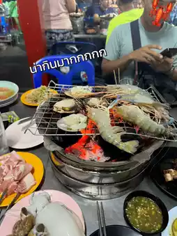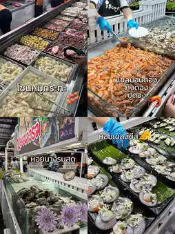 🦞 Ploy came to eat with friends on Friday evening. I must say that there were a lot of people!!! But it didn't take long to wait, about 20 minutes. The atmosphere in the restaurant was very hot. It was full of smoke from both the grill and the grilled pork. As for the fresh food, Ploy thinks it's okay. There's a lot of food around. Seafood, shrimp, shellfish, squid🐙, grilled pork🥓 and freshly cooked food, spicy salad, baked shrimp with glass noodles, crispy pork, roast duck, pickled salmon, sashimi, and so much more. I must say that I couldn't finish it all🥹 There really was a lot. There were also complete desserts, ice cream, cakes, fruits, and refillable drinks.