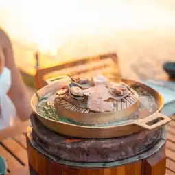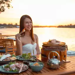 In the restaurant section ๐๐๐ก๐ ๐ฝ๐๐ฃ๐ ๐๐-๐๐ฃ ๐๐๐ฉ๐๐ง๐ฎ ๐๐ฃ๐ ๐ฝ๐๐ง is located on the riverside. The evening light is very beautiful. This evening, we ordered a barbecue with grilled shrimp. The weather is very good at this time. It is a happiness that makes us smile.