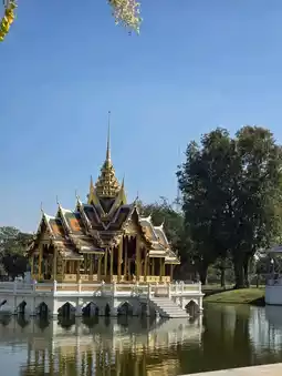 Bang Pa-In Palace is located in Bang Pa-in District, Ayutthaya Province. It takes 1 hour to get there by private car from Bangkok. There is an entrance fee: 20 baht for children under 140 cm, 30 baht for adults, and 100 baht for foreigners. It is recommended to dress neatly, wear long pants or a long skirt, and wear shoes that cover the heel for appropriateness when visiting the place. If anyone doesn't want to walk, there is a golf cart rental service for you to drive around yourself. The buildings inside are beautiful and clean. The place is spacious and shady. It is recommended to come in the morning so that it is not hot. You can walk around and see the beautiful place.