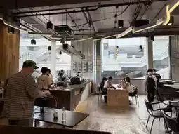 - The upper floor has a brighter vibe, a coffee bar, and a view of the train passing by